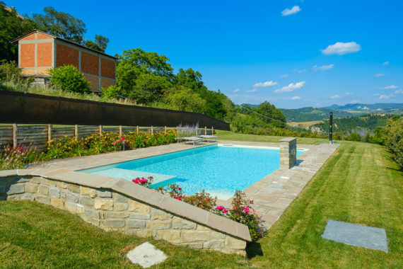 Realizzazione di piscina interrata in cemento armato, dotata di zona spiaggia, sedute idromassaggio, scalini per ingresso e cascata.